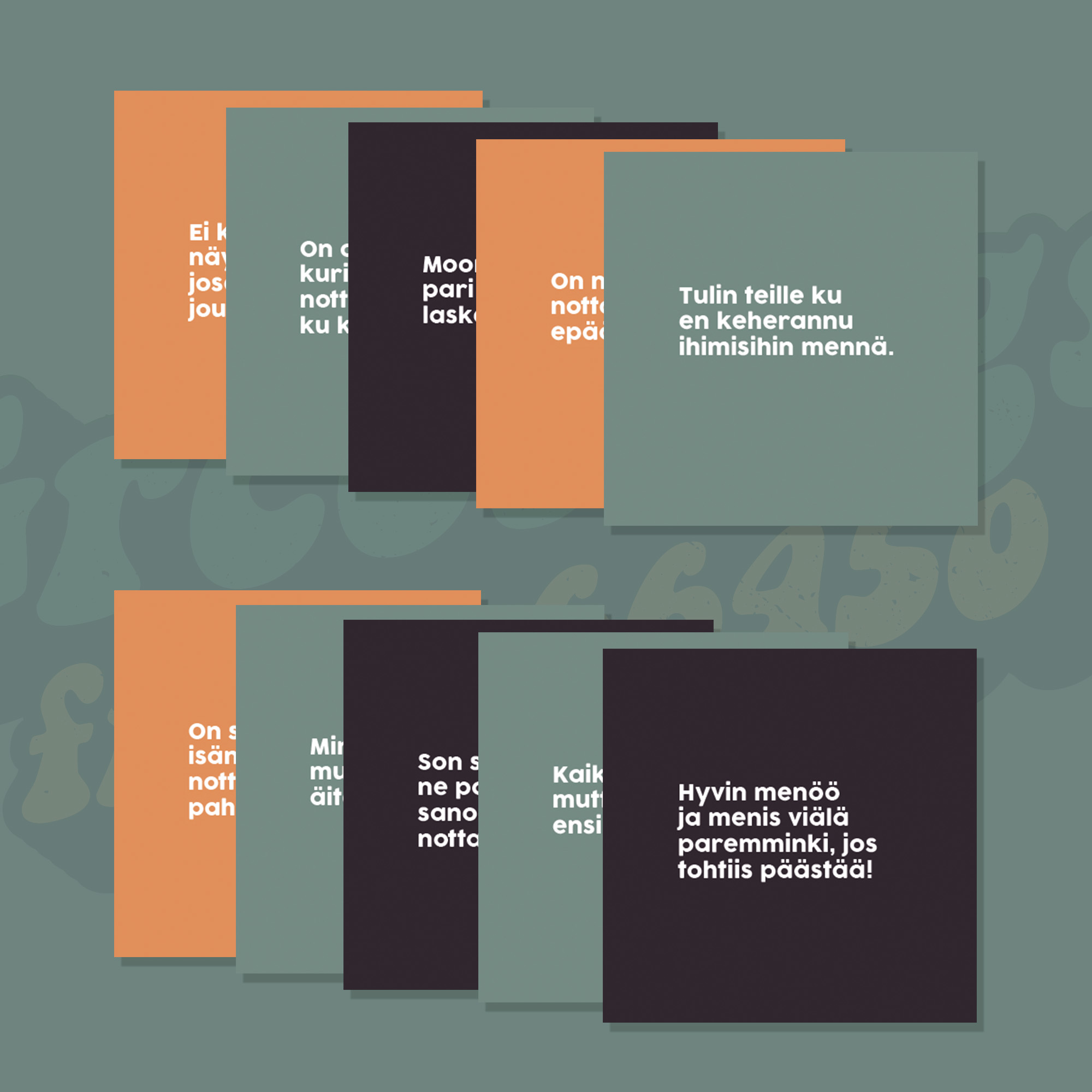 Setissä kymmenen kappaletta erilaista korttia. Kortin koko 14 cm x 14 cm.